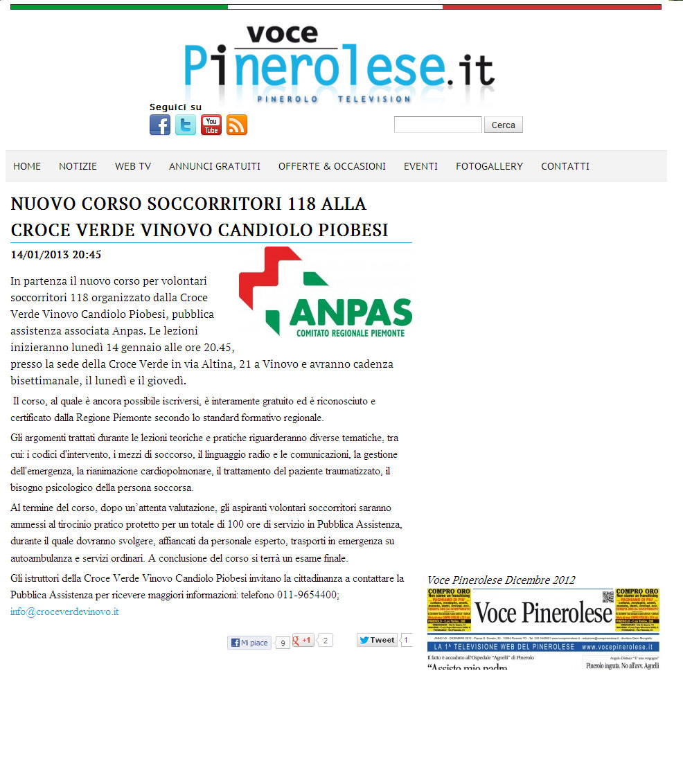 Area StampaRassegnaWeb Voce Pinerolese.it – Croce Verde Vinovo Candiolo Piobesi – Nuovo corso soccorritori 118 alla Croce Verde Vinovo Candiolo Piobesi 9 Gennaio 2013 Voce Pinerolese.it – Croce Verde Vinovo Candiolo Piobesi – Nuovo corso soccorritori 118 alla Croce Verde Vinovo Candiolo Piobesi (file JPG) Tweet