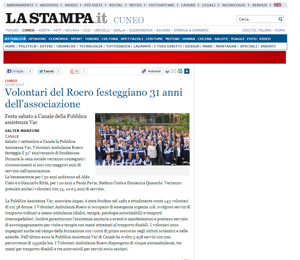 Area StampaRassegnaWeb La Stampa Cuneo – Var Canale – Volontari del Roero festeggiano 31 anni dell’associazione 5 Settembre 2013 La Stampa Cuneo – Var Canale – Volontari del Roero festeggiano 31 anni dell’associazione (file JPG) Tweet