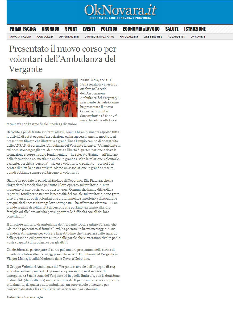 Area StampaRassegnaWeb Ok Novara.it – Volontari Ambulanza del Vergante – Presentato il nuovo corso per volontari dell’Ambulanza del Vergante 20 Ottobre 2013 20/10/2013 – Ok Novara.it – Volontari Ambulanza del Vergante – Presentato il nuovo corso per volontari dell’Ambulanza del Vergante Tweet
