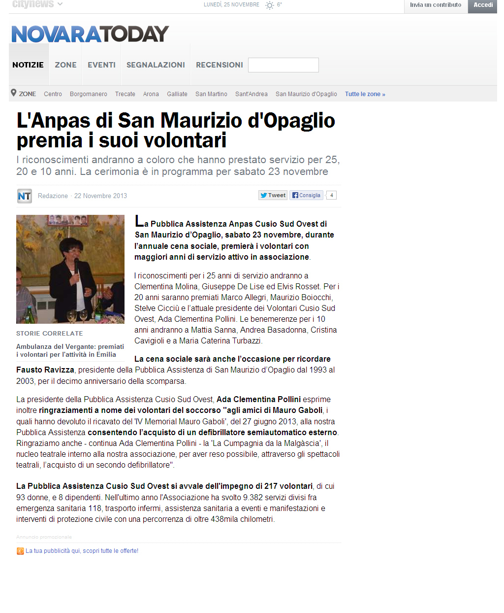 Area StampaRassegnaWeb Novara Today.it – Volontari Soccorso Cusio Sud Ovest – L’Anpas di San Maurizio d’Opaglio premia i suoi volontari 22 Novembre 2013 22/11/2013 – Novara Today.it – Volontari Soccorso Cusio Sud Ovest – L’Anpas di San Maurizio d’Opaglio premia i suoi volontari Tweet