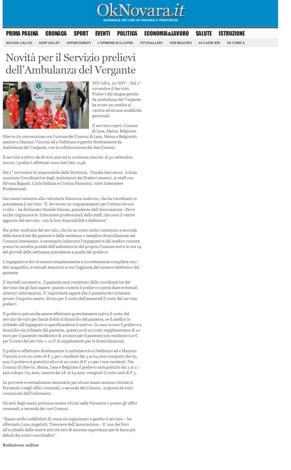 • 22/11/2013 – Ok Novara.it – Volontari Ambulanza del Vergante – Novità per il Servizio prelievi dell’Ambulanza del Vergante