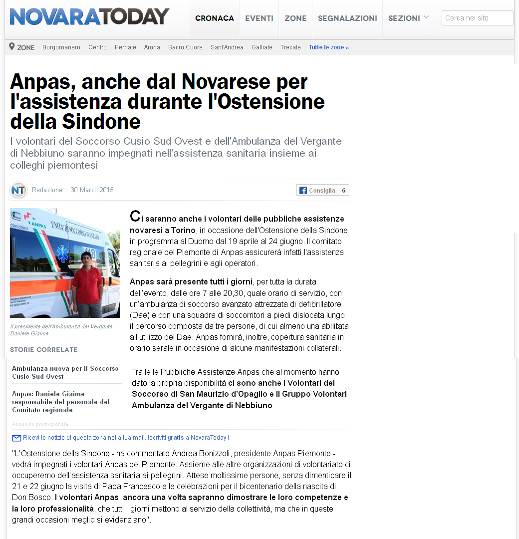 Area StampaRassegna 2015Web Novaratoday.it – Ambulanza del Vergante, Volontari Cusio Sud Ovest – Anpas, anche dal Novarese per l’assistenza durante l’ostensione della Sindone 30 Marzo 2015 30/03/2015 – Novaratoday.it – Ambulanza del Vergante, Volontari Cusio Sud Ovest – Anpas, anche dal Novarese per l’assistenza durante l’ostensione della Sindone Tweet
