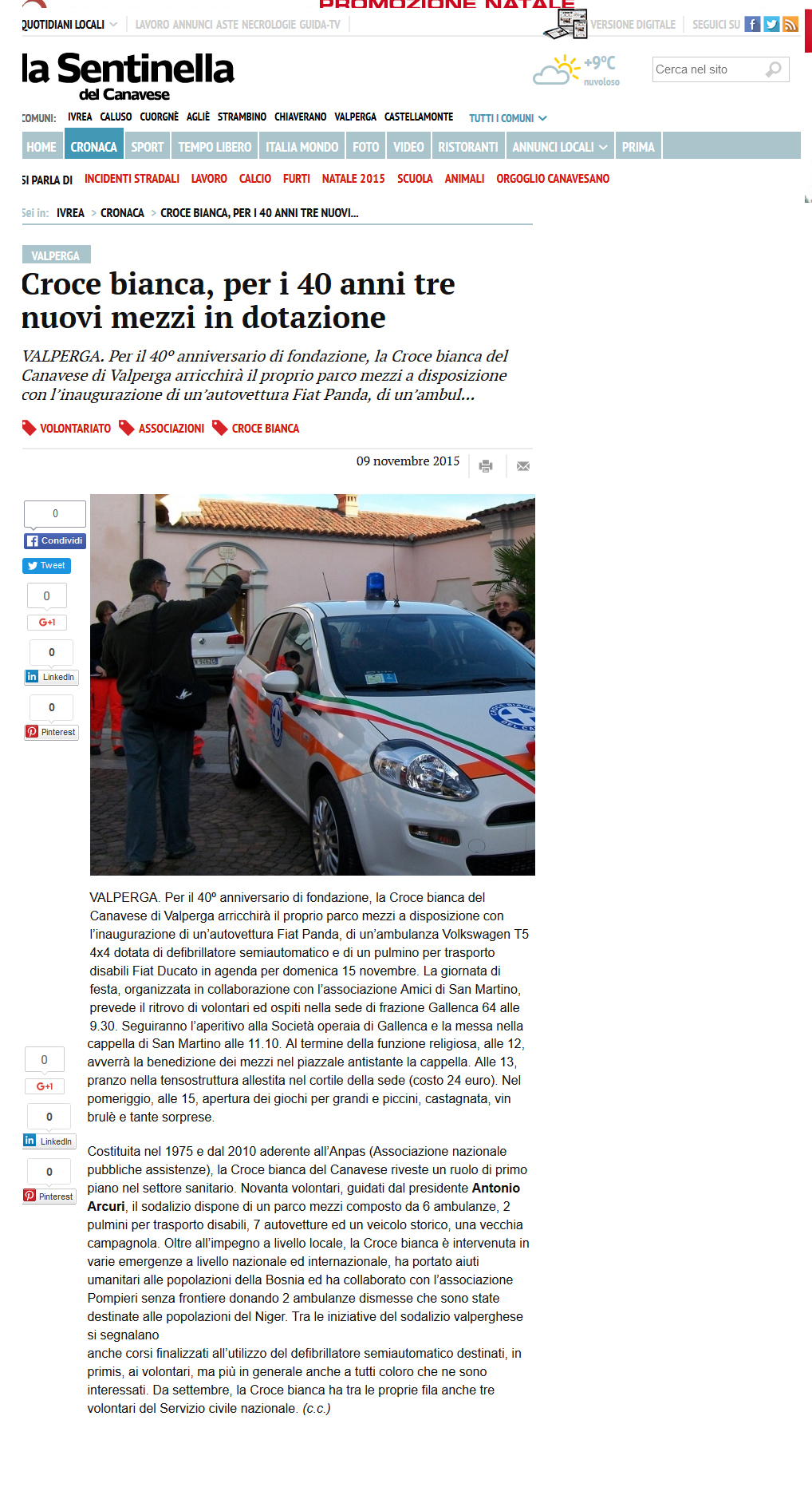 Area StampaRassegna 2015Web La Sentinella.it – Croce Bianca del Canavese – Croce bianca, per i 40 anni tre nuovi mezzi in dotazione 9 Novembre 2015 09/11/2015 – La Sentinella.it – Croce Bianca del Canavese – Croce bianca, per i 40 anni tre nuovi mezzi in dotazione Tweet