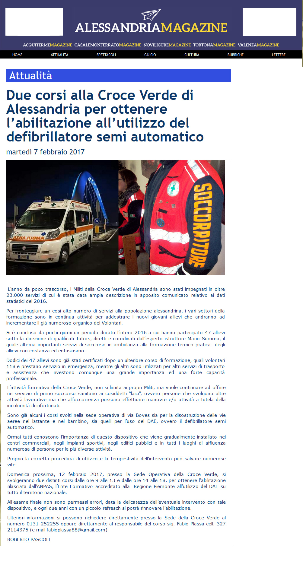 Area StampaRassegna 2017Web Alessandriamagazine.it – Due corsi alla Croce Verde di Alessandria per ottenere l’abilitazione all’utilizzo del defibrillatore semi automatico 7 Febbraio 2017 07/02/2017 – Alessandriamagazine.it – Due corsi alla Croce Verde di Alessandria per ottenere l’abilitazione all’utilizzo del defibrillatore semi automatico Tweet
