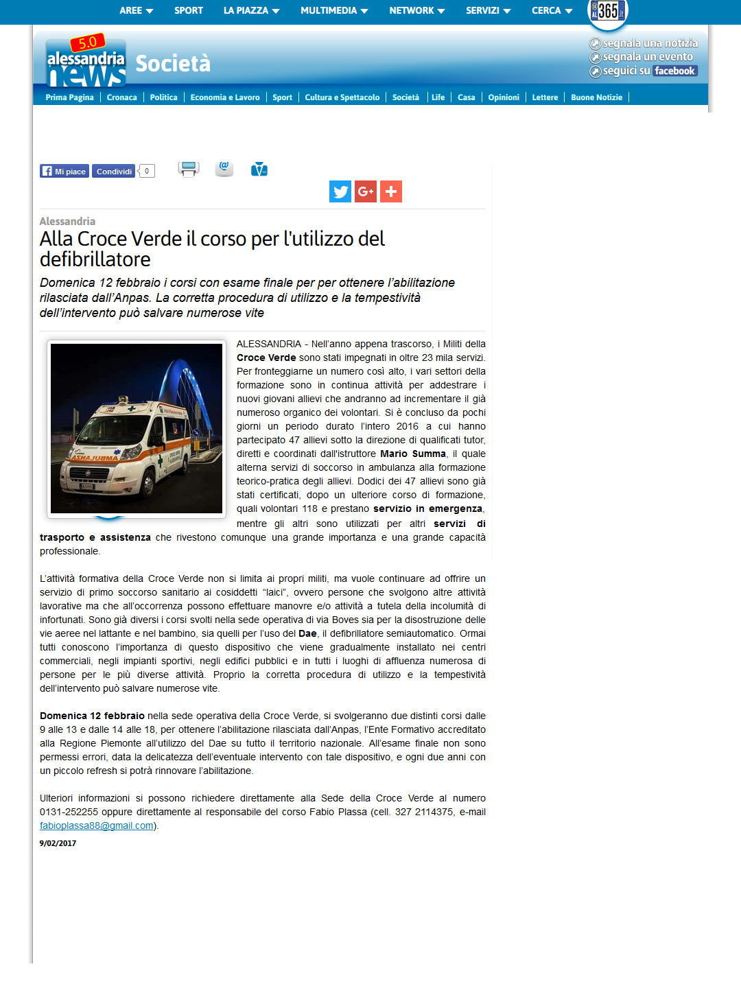 Area StampaRassegna 2017Web Alessandrianews.it – Croce Verde Alessandria – Alla Croce Verde il corso per l’utilizzo del defibrillatore 9 Febbraio 2017 09/02/2017 – Alessandrianews.it – Croce Verde Alessandria – Alla Croce Verde il corso per l’utilizzo del defibrillatore Tweet