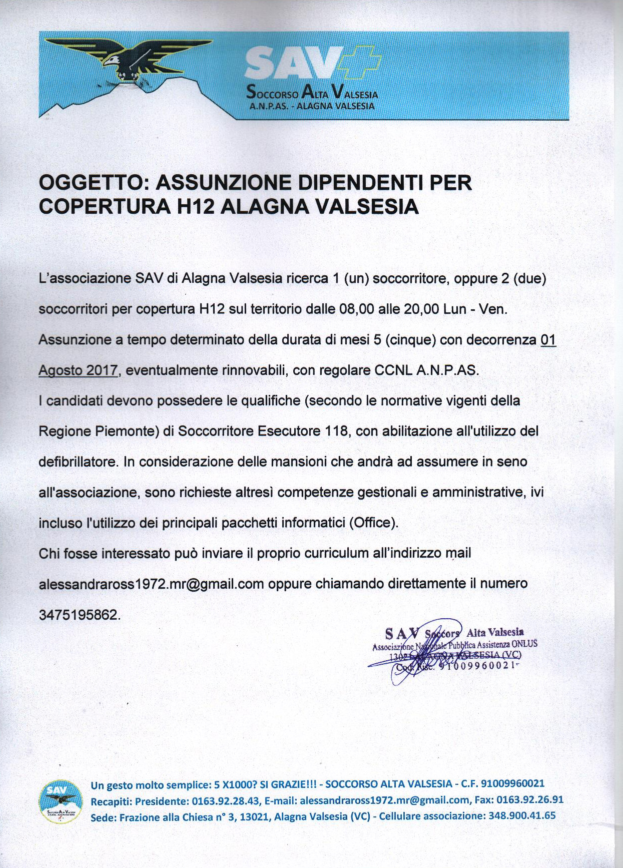 LAssunzione_SavAlagna’associazione SAV di Alagna Valsesia ricerca 1 (un) soccorritore, oppure 2 (due) soccorritori per copertura H12 sul territorio dalle 08,00 alle 20,00 Lun – Ven.