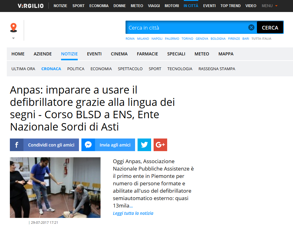 Area StampaRassegna 2017Web Virgilio.it – Anpas: imparare a usare il defibrillatore grazie alla lingua dei segni – Corso BLSD a ENS, Ente Nazionale Sordi di Asti 29 Luglio 2017 29/07/2017 – Virgilio.it – Anpas: imparare a usare il defibrillatore grazie alla lingua dei segni – Corso BLSD a ENS, Ente Nazionale Sordi di Asti Tweet