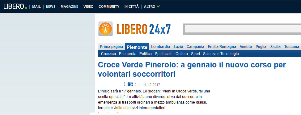 Area StampaRassegna 2017Web Libero.it – Croce Verde Pinerolo: a gennaio il nuovo corso per volontari soccorritori 11 Dicembre 2017 11/12/2017 – Libero.it – Croce Verde Pinerolo: a gennaio il nuovo corso per volontari soccorritori Tweet