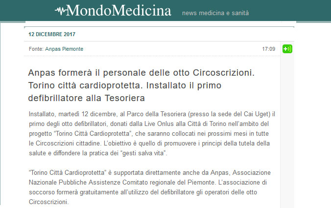 Area StampaRassegna 2017Web Mondomedicina – Anpas formerà il personale delle otto Circoscrizioni. Torino città cardioprotetta. Installato il primo defibrillatore alla Tesoriera 12 Dicembre 2017 12/12/2017 – Mondomedicina – Anpas formerà il personale delle otto Circoscrizioni. Torino città cardioprotetta. Installato il primo defibrillatore alla Tesoriera Tweet