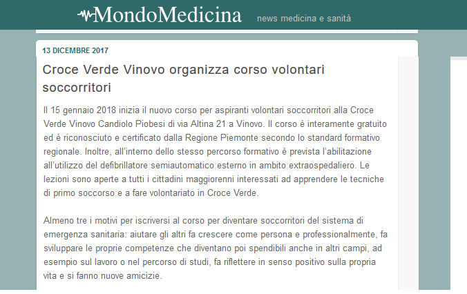 Area StampaRassegna 2017Web Mondomedicina.it – Croce Verde Vinovo organizza corso volontari soccorritori 13 Dicembre 2017 13/12/2017 – Mondomedicina.it – Croce Verde Vinovo organizza corso volontari soccorritori Tweet