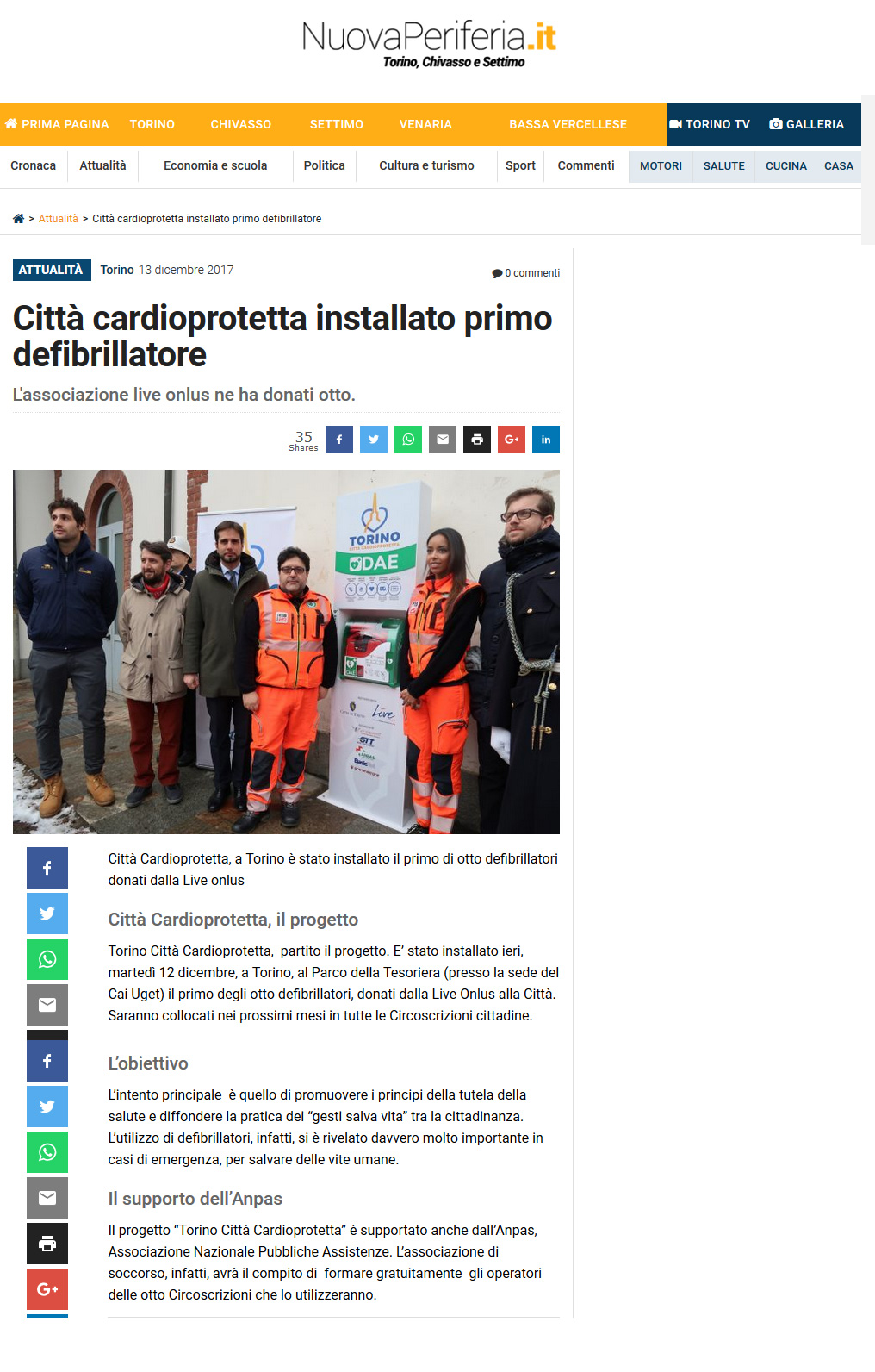 Area StampaRassegna 2017Web Nuova Periferia – Anpas – Città cardioprotetta installato primo defibrillatore 13 Dicembre 2017 13/12/2017 – Nuova Periferia.it – Anpas – Città cardioprotetta installato primo defibrillatore Tweet