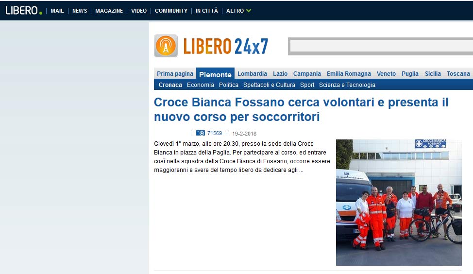 Area StampaRassegna 2018Web Libero.it – Croce Bianca Fossano cerca volontari e presenta il nuovo corso per soccorritori 19 Febbraio 2018 19/02/2018 – Libero.it – Croce Bianca Fossano cerca volontari e presenta il nuovo corso per soccorritori Tweet