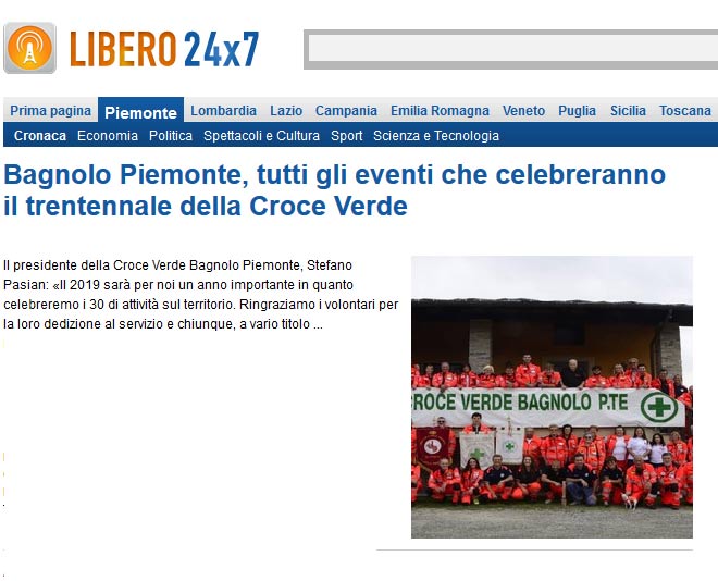 Area StampaRassegna 2019Web Libero.it – Croce Verde Bagnolo – Bagnolo Piemonte, tutti gli eventi che celebreranno il trentennale della Croce Verde 2 Gennaio 2019 02/01/2019 – Libero.it – Croce Verde Bagnolo – Bagnolo Piemonte, tutti gli eventi che celebreranno il trentennale della Croce Verde Tweet