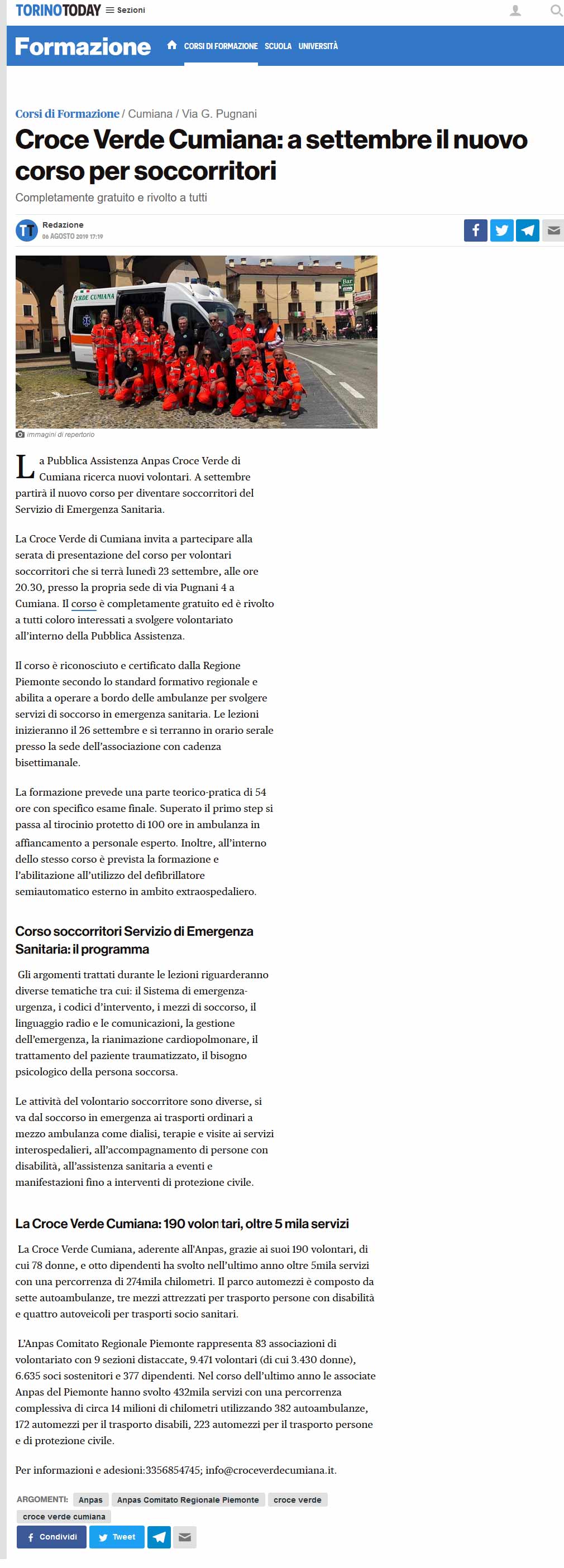 Area StampaRassegna 2019Web TorinoToday.it – Croce Verde Cumiana – A settembre il nuovo corso per soccorritori 6 Agosto 2019 06/08/2019 – TorinoToday.it – Croce Verde Cumiana – A settembre il nuovo corso per soccorritori Tweet