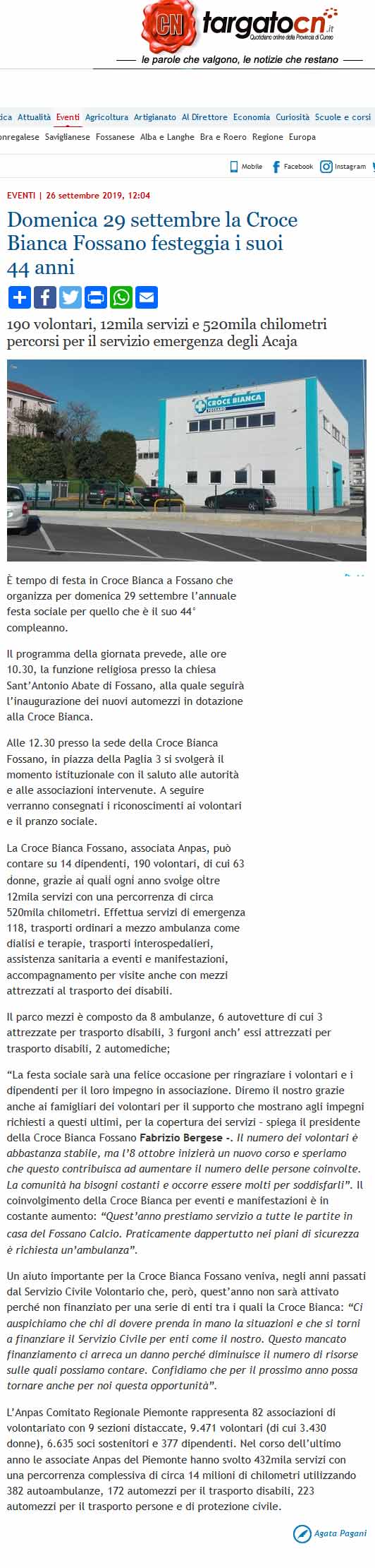 • 26/09/2019 – Targatocn.it – Croce Bianca Fossano – Domenica 29 settembre la Croce Bianca Fossano festeggia i suoi 44 anni