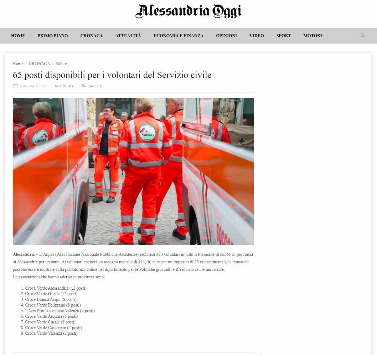 Area StampaRassegna 2022servizio civileWeb AlessandriaOggi.info | Anpas | 65 posti disponibili per i volontari del Servizio civile 8 Gennaio 2022 08/01/2022 AlessandriaOggi.info | Anpas | 65 posti disponibili per i volontari del Servizio civile Tweet