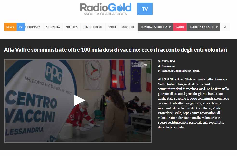 • 08/01/2022 RadioGold.it | Croce Verde Alessandria | Alla Valfrè somministrate oltre 100 mila dosi di vaccino: ecco il racconto degli enti volontari