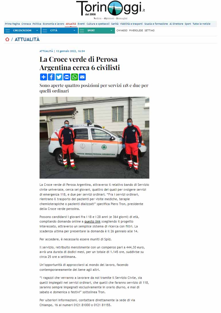 Area StampaRassegna 2022servizio civileWeb TorinOggi.it | Croce Verde Perosa Argentina | La Croce Verde di Perosa Argentina cerca 6 civilisti 12 Gennaio 2022 12/01/2022 TorinOggi.it | Croce Verde Perosa Argentina | La Croce Verde di Perosa Argentina cerca 6 civilisti Tweet