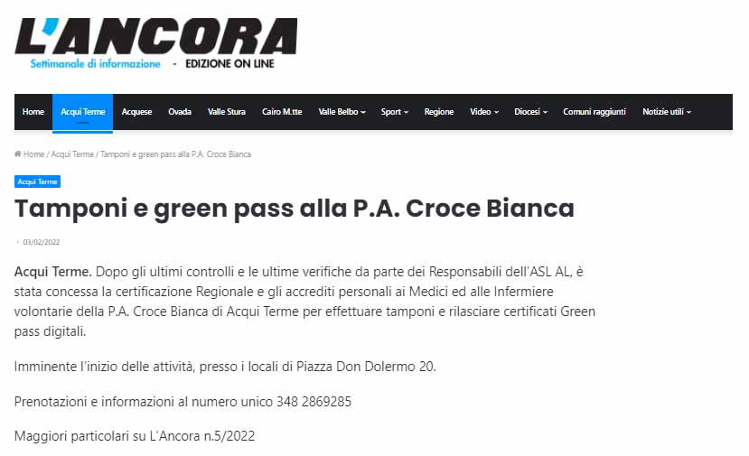 Area StampaRassegna 2022Web Settimanalelancora.it | Croce Bianca Acqui Terme | Tamponi e green pass alla PA Croce Bianca 3 Febbraio 2022 03/02/2022 Settimanalelancora.it | Croce Bianca Acqui Terme | Tamponi e green pass alla PA Croce Bianca Tweet