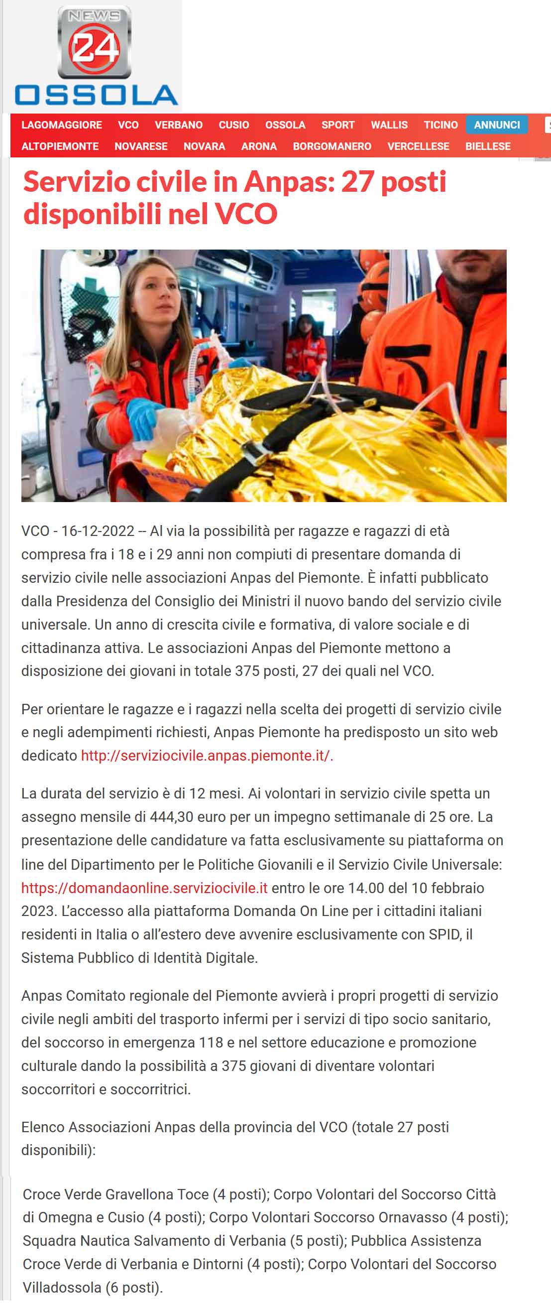Area StampaRassegna 2022servizio civileWeb OssolaNews.it | Anpas | Servizio civile in Anpas: 27 posti disponibili nel VCO 16 Dicembre 2022 16/12/2022 OssolaNews.it | Anpas | Servizio civile in Anpas: 27 posti disponibili nel VCO Tweet