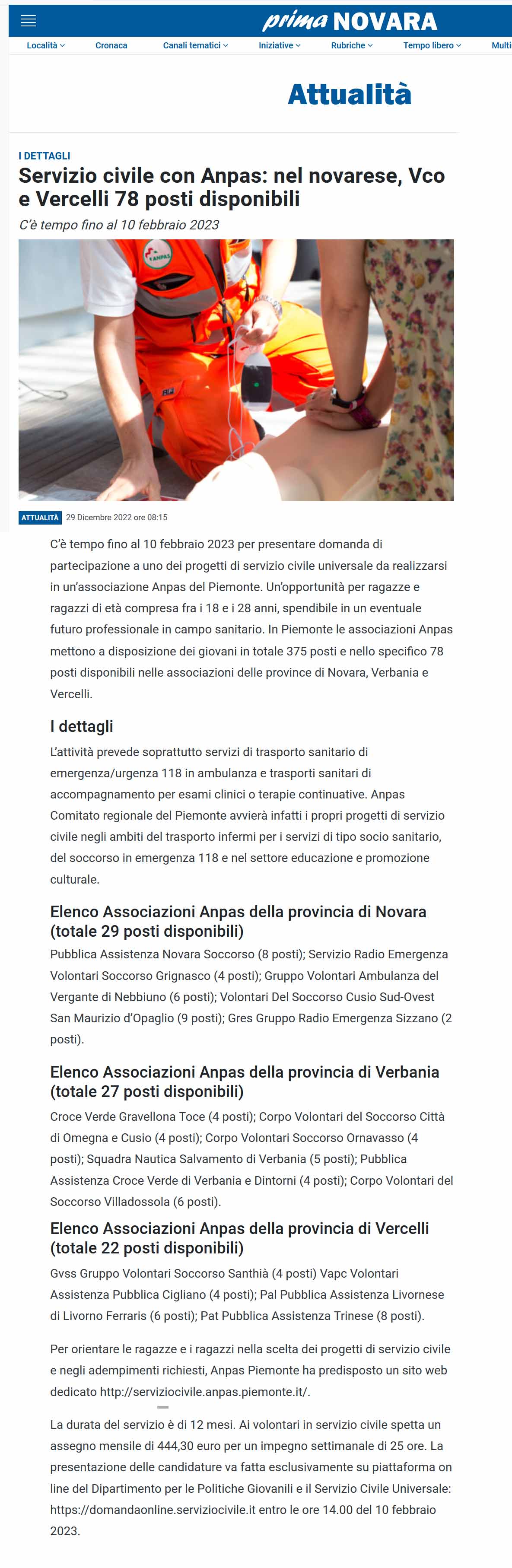 Area StampaRassegna 2022servizio civileWeb PrimaNovara.it | Anpas | Servizio civile con Anpas: nel novarese, Vco e Vercelli 78 posti disponibili 29 Dicembre 2022 29/12/2022 PrimaNovara.it | Anpas | Servizio civile con Anpas: nel novarese, Vco e Vercelli 78 posti disponibili Tweet