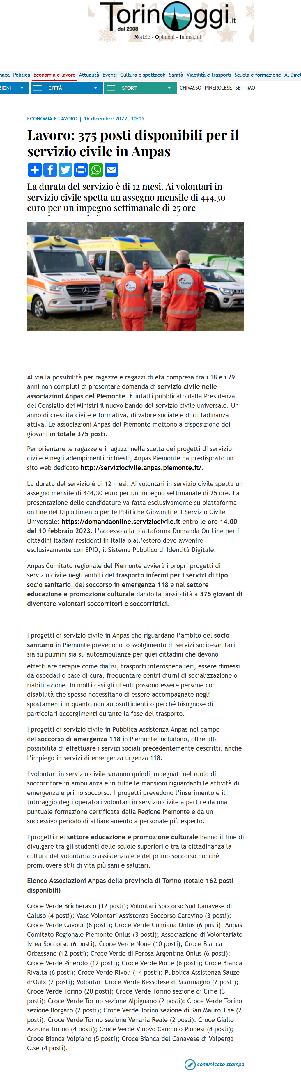 Area StampaRassegna 2022servizio civileWeb TorinOggi.it | Anpas | Lavoro: 375 posti disponibili per il servizio civile in Anpas 16 Dicembre 2022 16/12/2022 TorinOggi.it | Anpas | Lavoro: 375 posti disponibili per il servizio civile in Anpas Tweet
