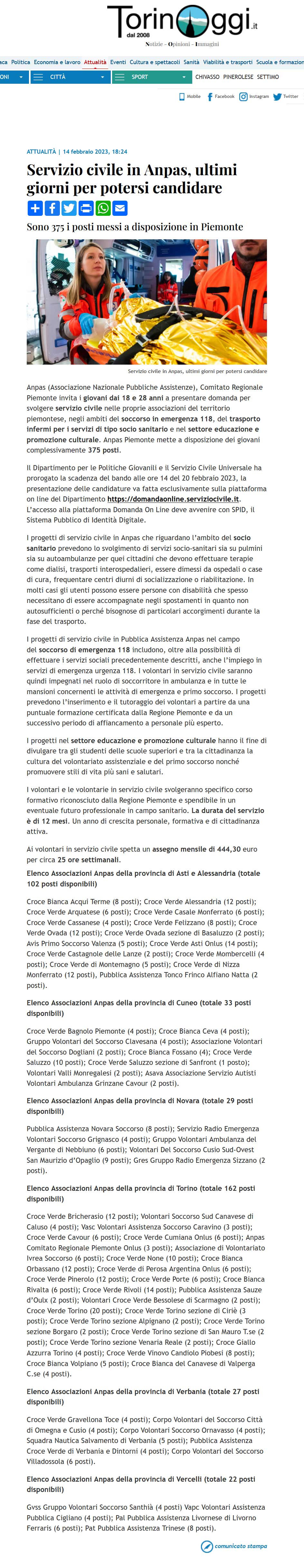 Area StampaRassegna 2023servizio civileWeb TorinOggi.it | Servizio civile in Anpas, ultimi giorni per potersi candidare 14 Febbraio 2023 14/02/2023 TorinOggi.it | Servizio civile in Anpas, ultimi giorni per potersi candidare Tweet