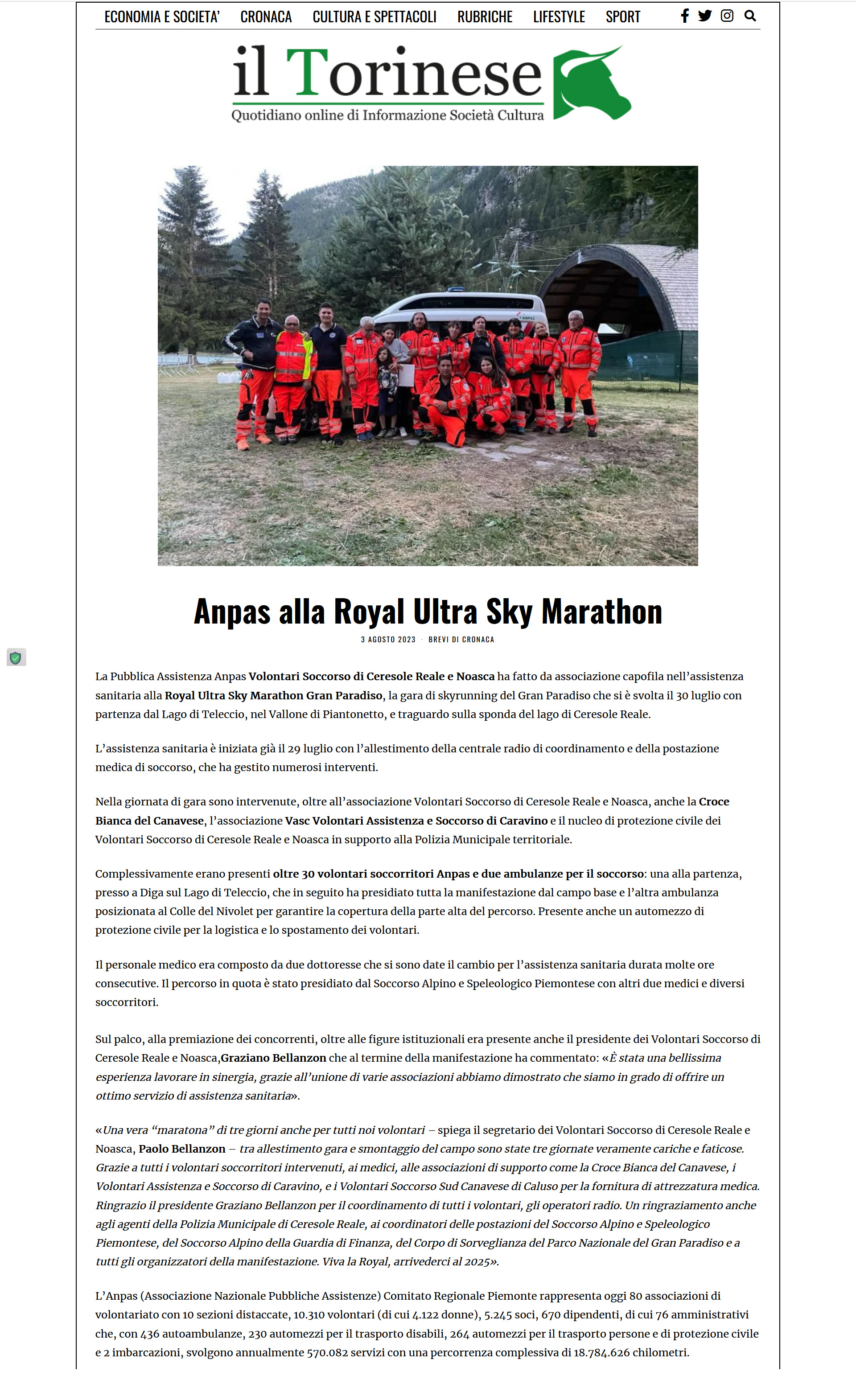 Area StampaRassegna 2023Web Il Torinese.it | Anpas alla Royal Ultra Sky Marathon 3 Agosto 2023 03/08/2023 Il Torinese.it | Anpas alla Royal Ultra Sky Marathon Tweet