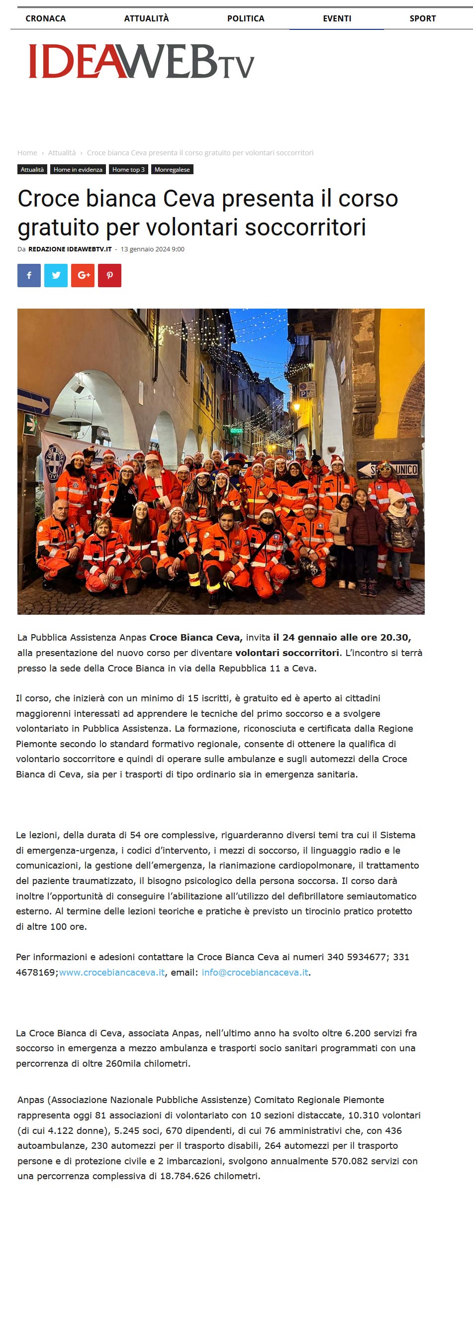 Area StampaRassegna 2024Web IdeaWebTv.it | Croce Bianca Ceva presenta il corso gratuito per volontari soccorritori 13 Gennaio 2024 13/01/2024 IdeaWebTv.it | Croce Bianca Ceva presenta il corso gratuito per volontari soccorritori Tweet
