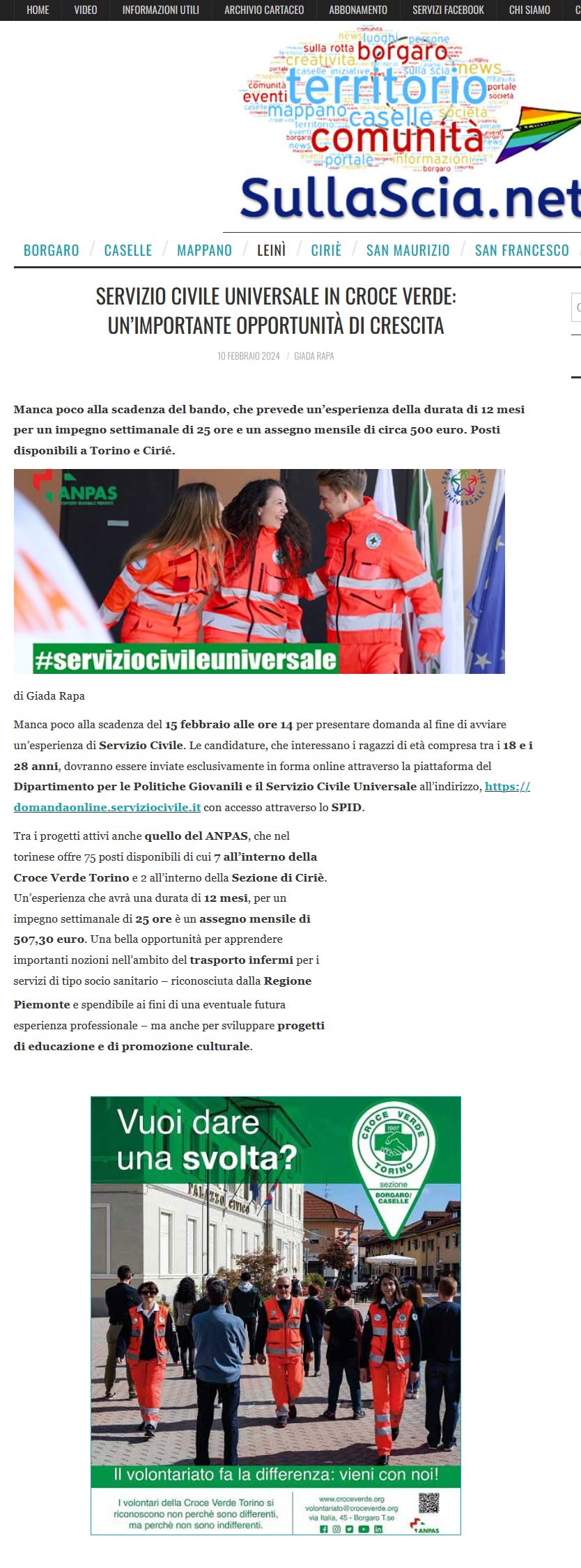 Area StampaRassegna 2024servizio civileWeb Sullascia.net | Croce Verde Torino | Servizio Civile Universale in Croce Verde: un’importante opportunità di crescita 10 Febbraio 2024 10/02/2024 Sullascia.net | Croce Verde Torino | Servizio Civile Universale in Croce Verde: un’importante opportunità di crescita Tweet