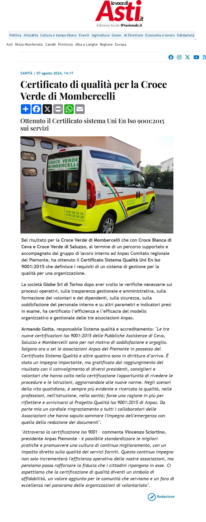 Area StampaRassegna 2024Web La Voce di Asti.it | Croce Verde Mombercelli, Croce Bianca Ceva, Croce Verde Saluzzo | Certificato di qualità per la Croce Verde di Mombercelli 7 Agosto 2024 07/08/2024 La Voce di Asti.it | Croce Verde Mombercelli, Croce Bianca Ceva, Croce Verde Saluzzo | Certificato di qualità per la Croce Verde di Mombercelli Tweet