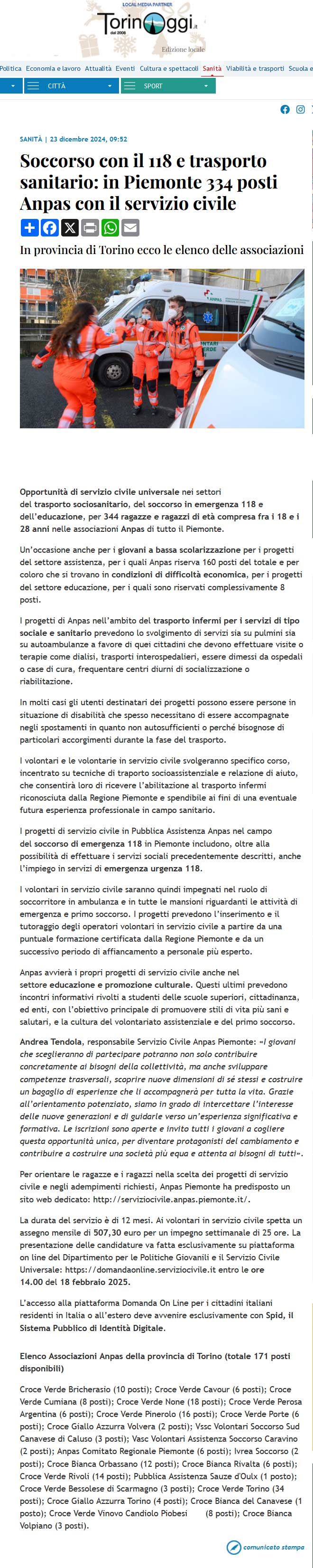 Area StampaRassegna 2024servizio civileWeb TorinOggi.it | Anpas | Soccorso con il 118 e trasporto sanitario: in Piemonte 334 posti Anpas con il servizio civile 23 Dicembre 2024 23/12/2024 TorinOggi.it | Anpas | Soccorso con il 118 e trasporto sanitario: in Piemonte 334 posti Anpas con il servizio civile Tweet