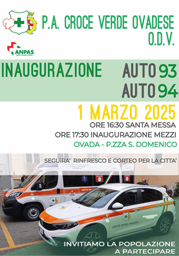 Sabato 1° marzo 2025 alle ore 17:30, in piazza San Domenico a Ovada, l’associazione Anpas Croce Verde Ovadese inaugurerà una nuova autovettura e un’ambulanza.