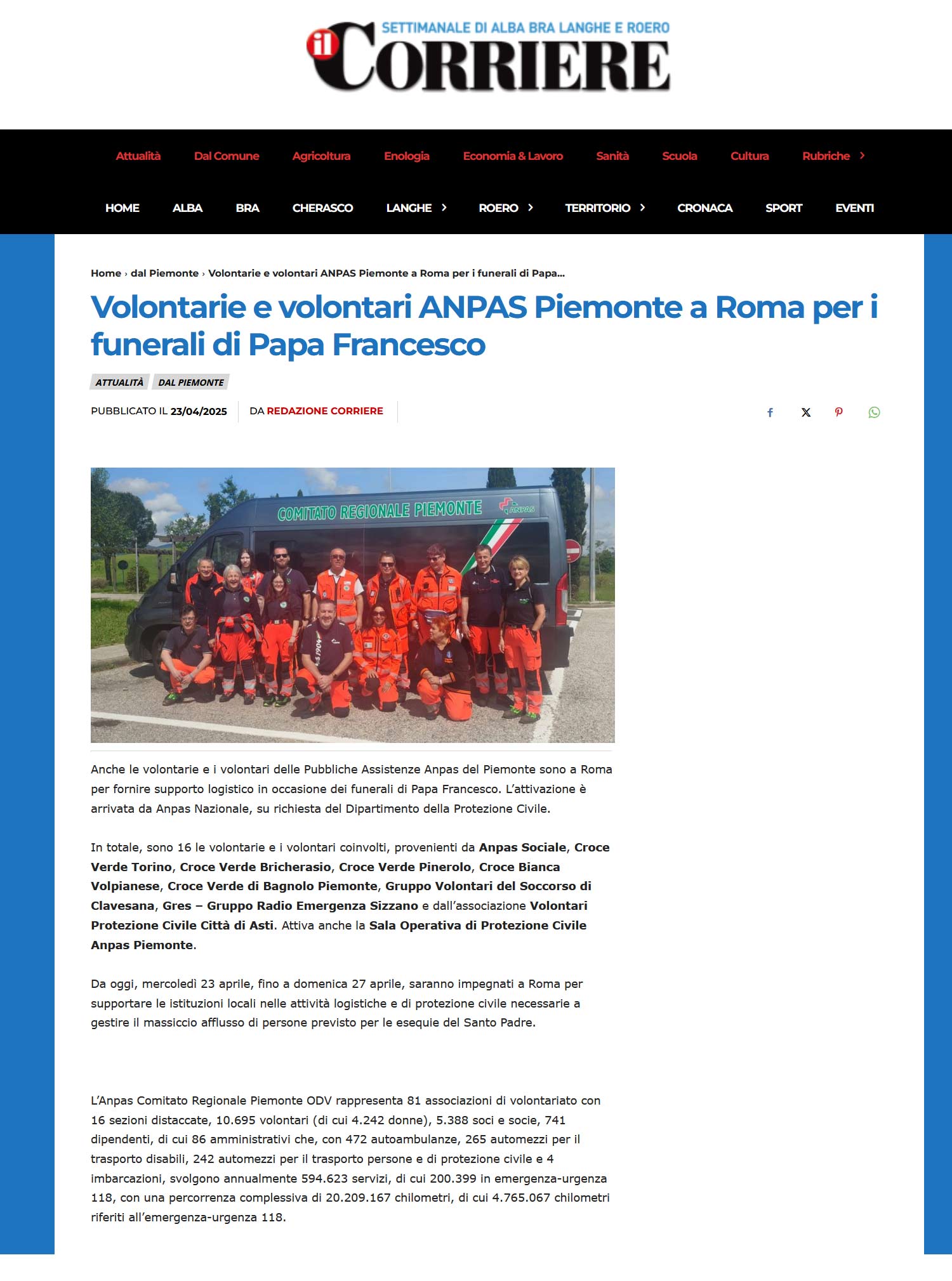 Area StampaFunerali Papa FrancescoRassegna 2025Web Corriere di Alba.net | Anpas | Volontarie e volontari Anpas Piemonte a Roma per i funerali di Papa Francesco 23 Aprile 2025 23/04/2025 Corriere di Alba.net | Anpas | Volontarie e volontari Anpas Piemonte a Roma per i funerali di Papa Francesco Tweet