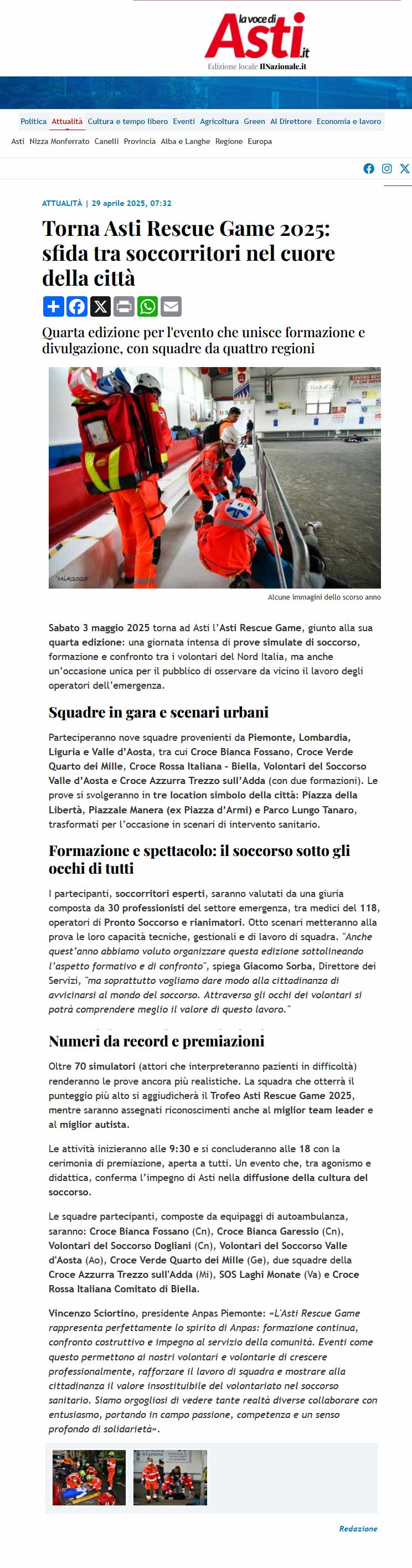 Area StampaAsti Rescue GameRassegna 2025Web La Voce di Asti.it | Croce Verde Asti | Torna Asti Rescue Game 2025: sfida tra soccorritori nel cuore della città 29 Aprile 2025 29/04/2025 La Voce di Asti.it | Croce Verde Asti | Torna Asti Rescue Game 2025: sfida tra soccorritori nel cuore della città Tweet