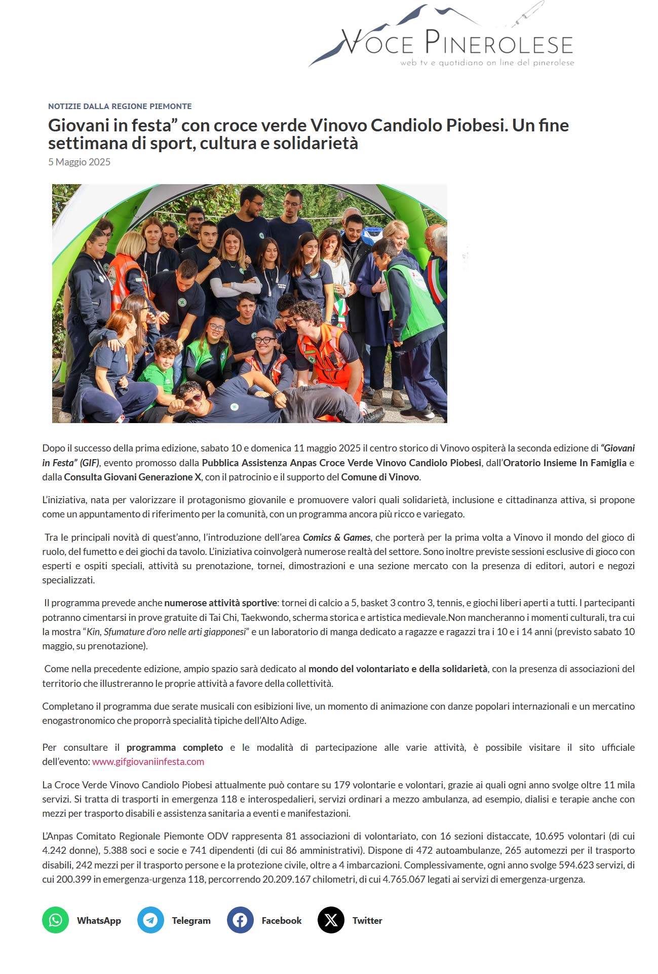 • 05/05/2025 Voce Pinerolese.it | Croce Verde Vinovo Candiolo Piobesi | “Giovani in festa” con Croce Verde Vinovo Candiolo Piobesi. Un fine settimana di sport, cultura e solidarietà