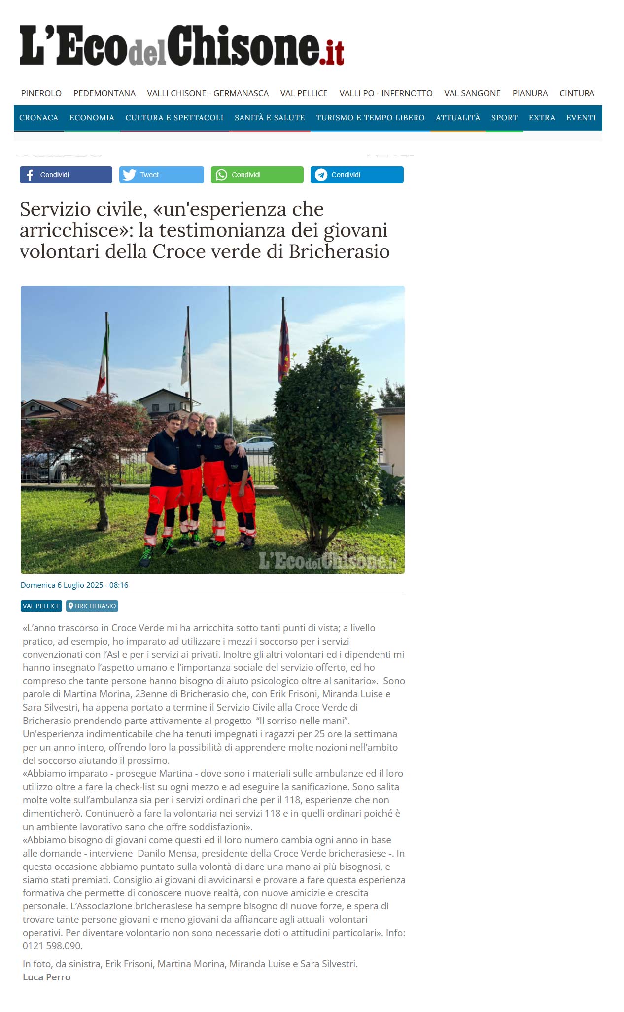 Area StampaRassegna 2025servizio civileWeb Eco del Chisone.it | Croce Verde Bricherasio | Servizio civile, «un’esperienza che arricchisce»: la testimonianza dei giovani volontari della Croce verde di Bricherasio 6 Luglio 2025 06/07/2025 Eco del Chisone.it | Croce Verde Bricherasio | Servizio civile, «un’esperienza che arricchisce»: la testimonianza dei giovani volontari della Croce verde di Bricherasio Tweet