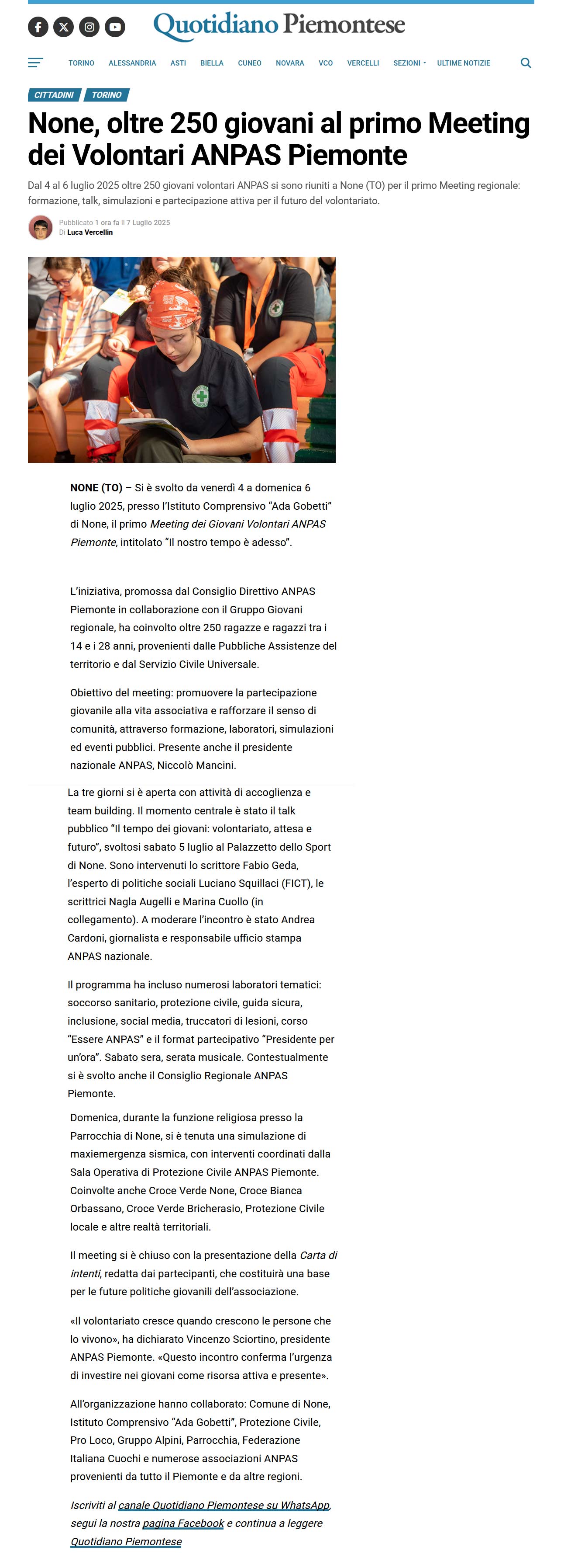 • 07/07/2025 Quotidiano Piemontese.it | Anpas | None, oltre 250 giovani al primo Meeting dei Volontari ANPAS Piemonte