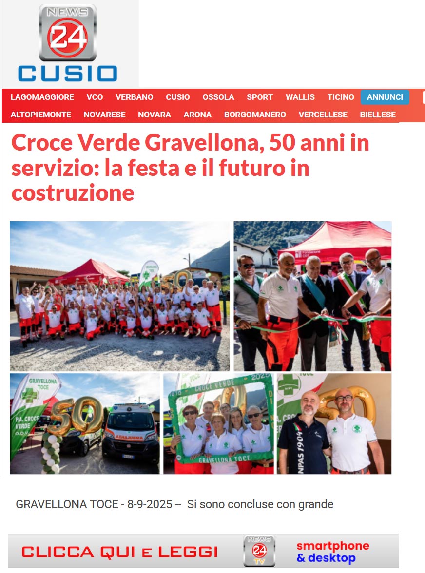 50 anni Croce Verde Gravellona ToceArea StampaRassegna 2025Web Cusio24.it | Croce Verde Gravellona Toce, 50 anni in servizio: la festa e il futuro in costruzione 8 Settembre 2025 08/09/2025 Cusio24.it | Croce Verde Gravellona Toce, 50 anni in servizio: la festa e il futuro in costruzione Tweet