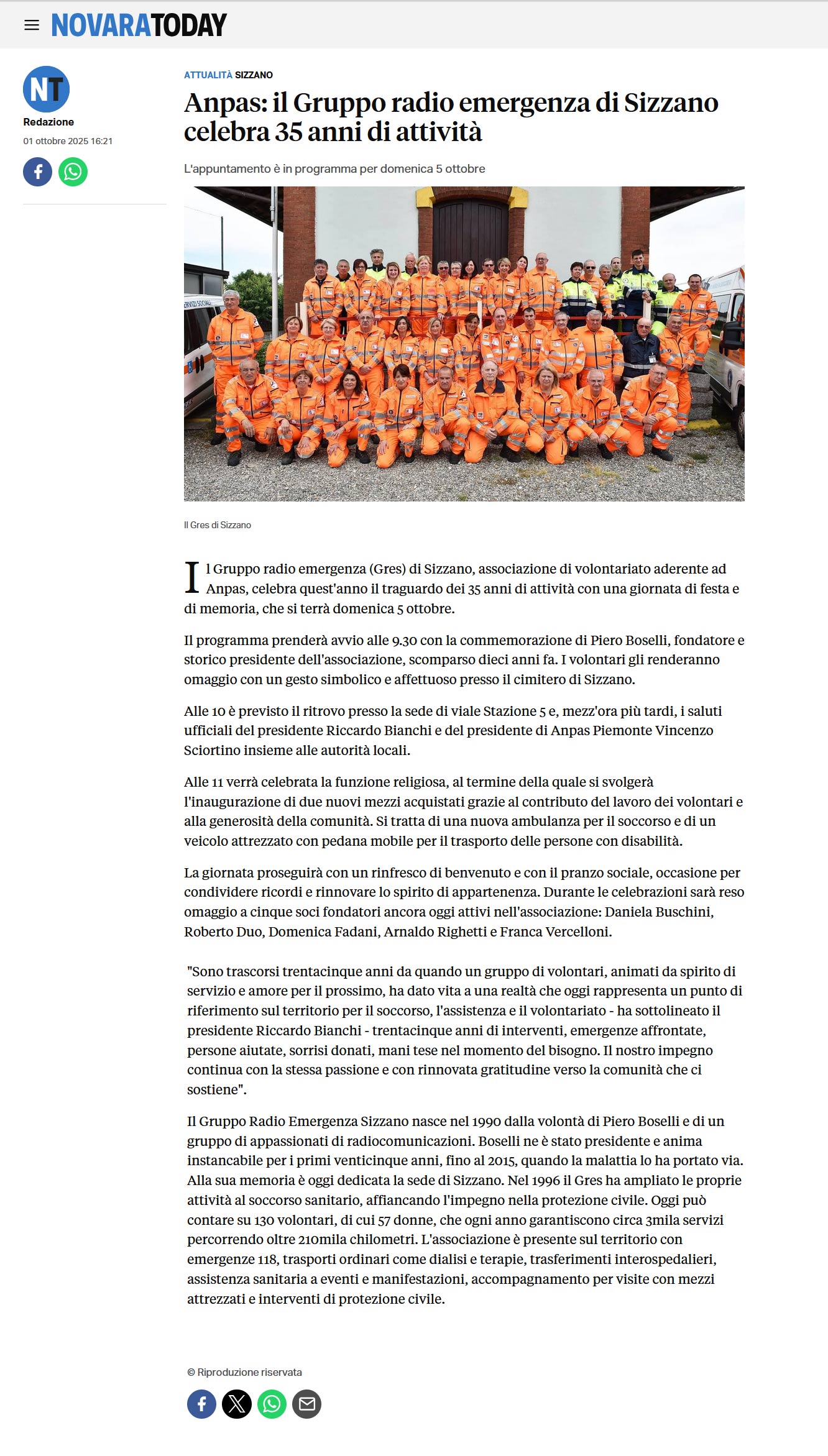 Area StampaRassegna 2025Web Novara Today.it | Gres Gruppo Radio Emergenza di Sizzano | Anpas: il Gruppo Radio Emergenza di Sizzano celebra 35 anni di attività 1 Ottobre 2025 01/10/2025 Novara Today.it | Gres Gruppo Radio Emergenza di Sizzano | Anpas: il Gruppo Radio Emergenza di Sizzano celebra 35 anni di attività Tweet