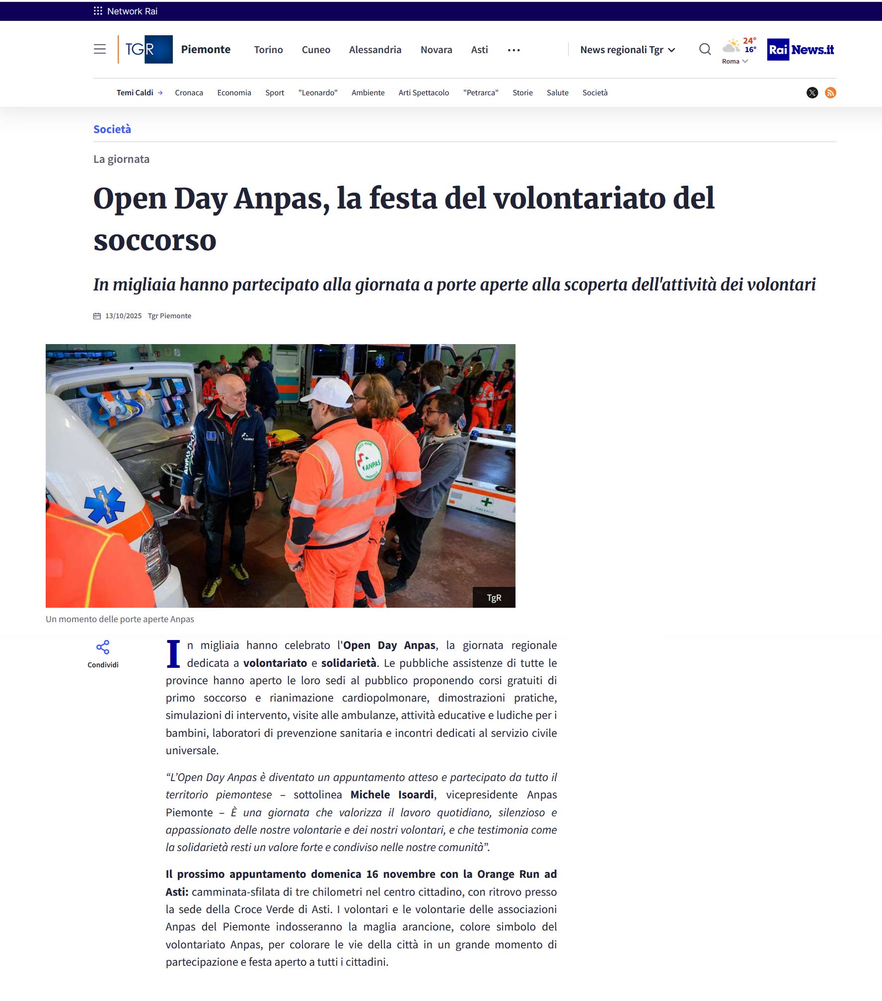 Area StampaOpen Day AnpasRassegna 2025Web Rainews.it Tgr Piemonte | Open Day Anpas, la festa del volontariato del soccorso 13 Ottobre 2025 13/10/2025 Rainews.it Tgr Piemonte | Open Day Anpas, la festa del volontariato del soccorso Tweet
