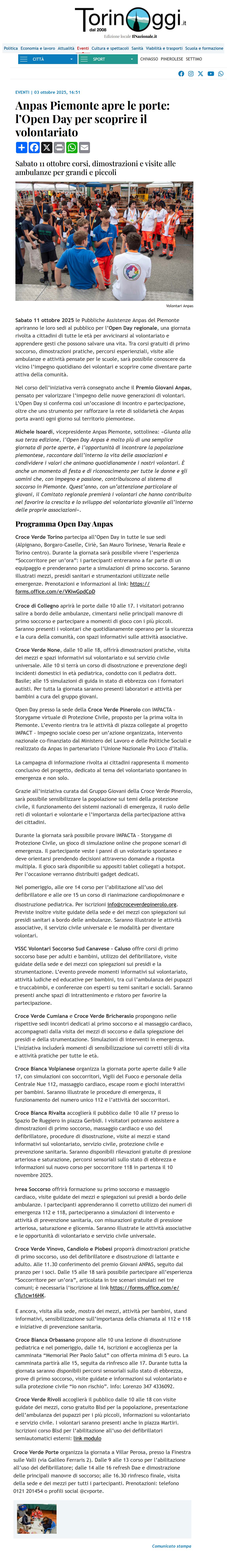 Area StampaOpen Day AnpasRassegna 2025Web Torino Oggi.it | Anpas Piemonte apre le porte: l’Open Day per scoprire il volontariato 3 Ottobre 2025 03/10/2025 Torino Oggi.it | Anpas Piemonte apre le porte: l’Open Day per scoprire il volontariato Tweet